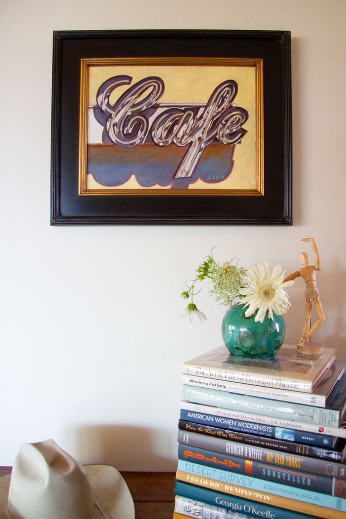 With over 50 years as an illustrator, Dennis Ziemienski proves he's a pro with this expertly painted neon café sign. Part nostalgia, part today, this piece uses color and light like on Dennis can. Hang this baby in the kitchen for bistro vibes any time.