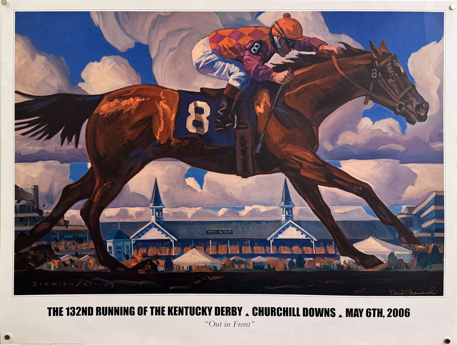 Run for the roses with a vintage Kentucky Derby poster by official 2006 artist Dennis Ziemienski. Lucky number 8, Barbaro, won the Derby this year and Ziemienski predicted it with this painting created months in advance of the race.