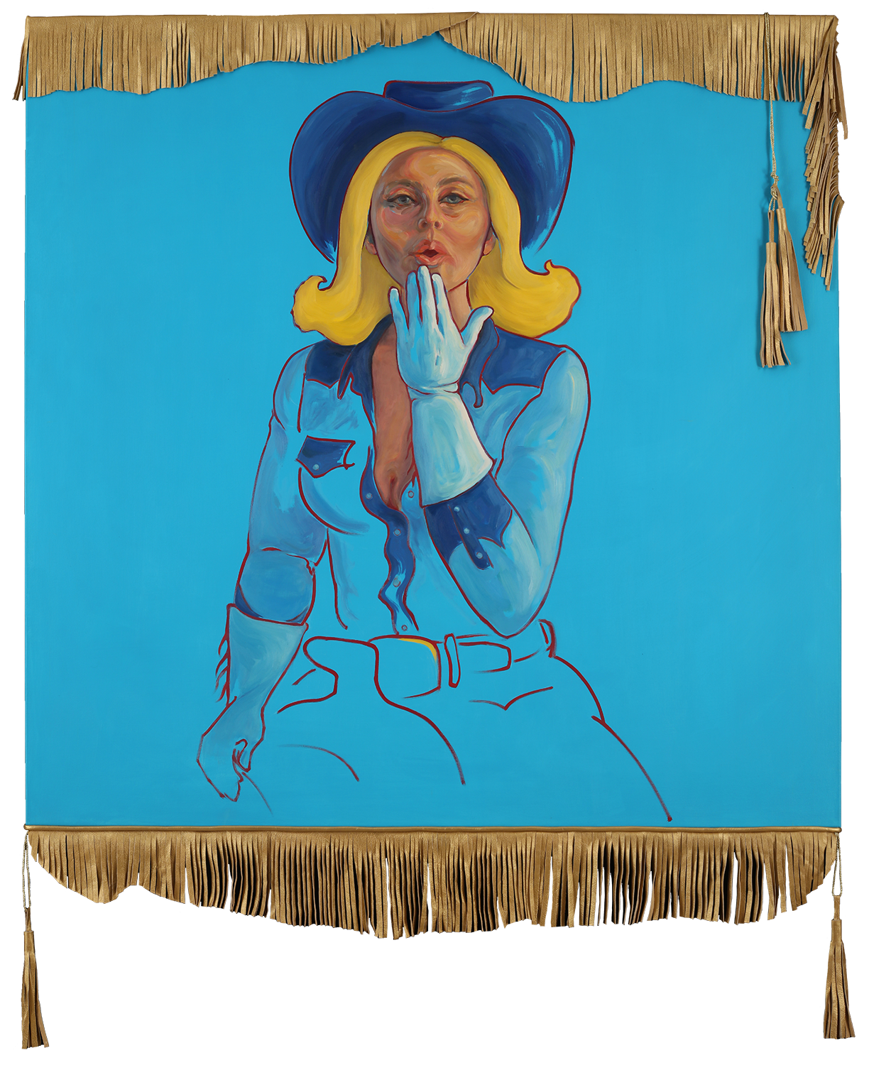 Channel those vintage rodeo queen vibes with a pinup cowgirl painting by Gina Teichert. Fringe Benefits pairs the winking playfulness of Old West revival shows with a pop sensibility and big bold blues. Trimmed with hand cut gold buckskin fringe, this outsize piece is sure to wow.