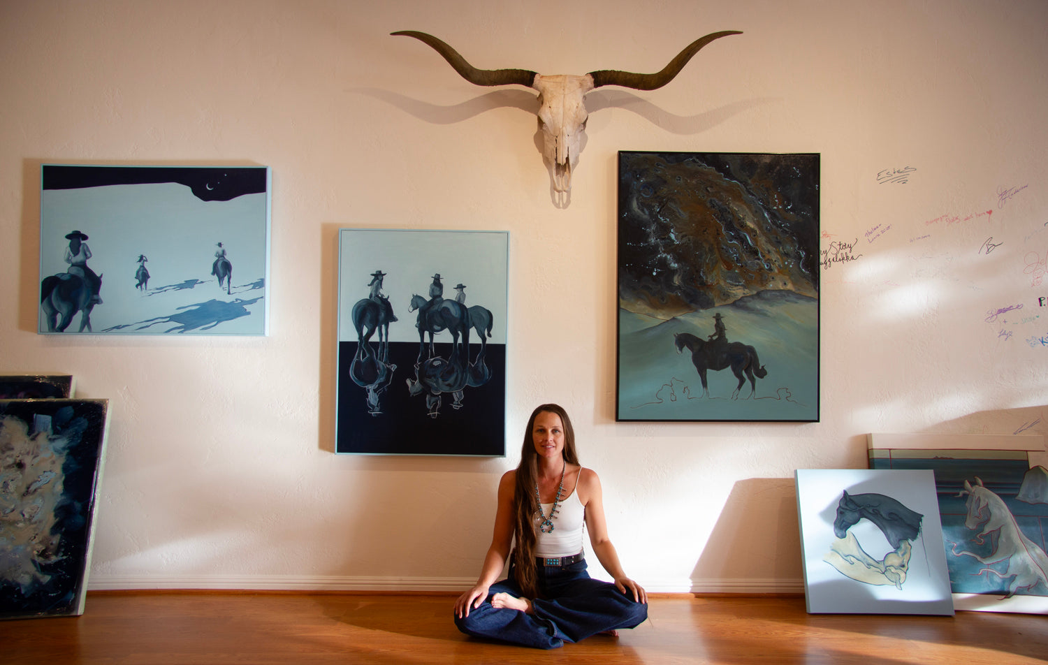 Part of her Cosmic Cowgirl series, this work plays with ideas of light and dark, above and below. The original work was featured at the Coors Young Guns exhibition in Denver, Colorado.
