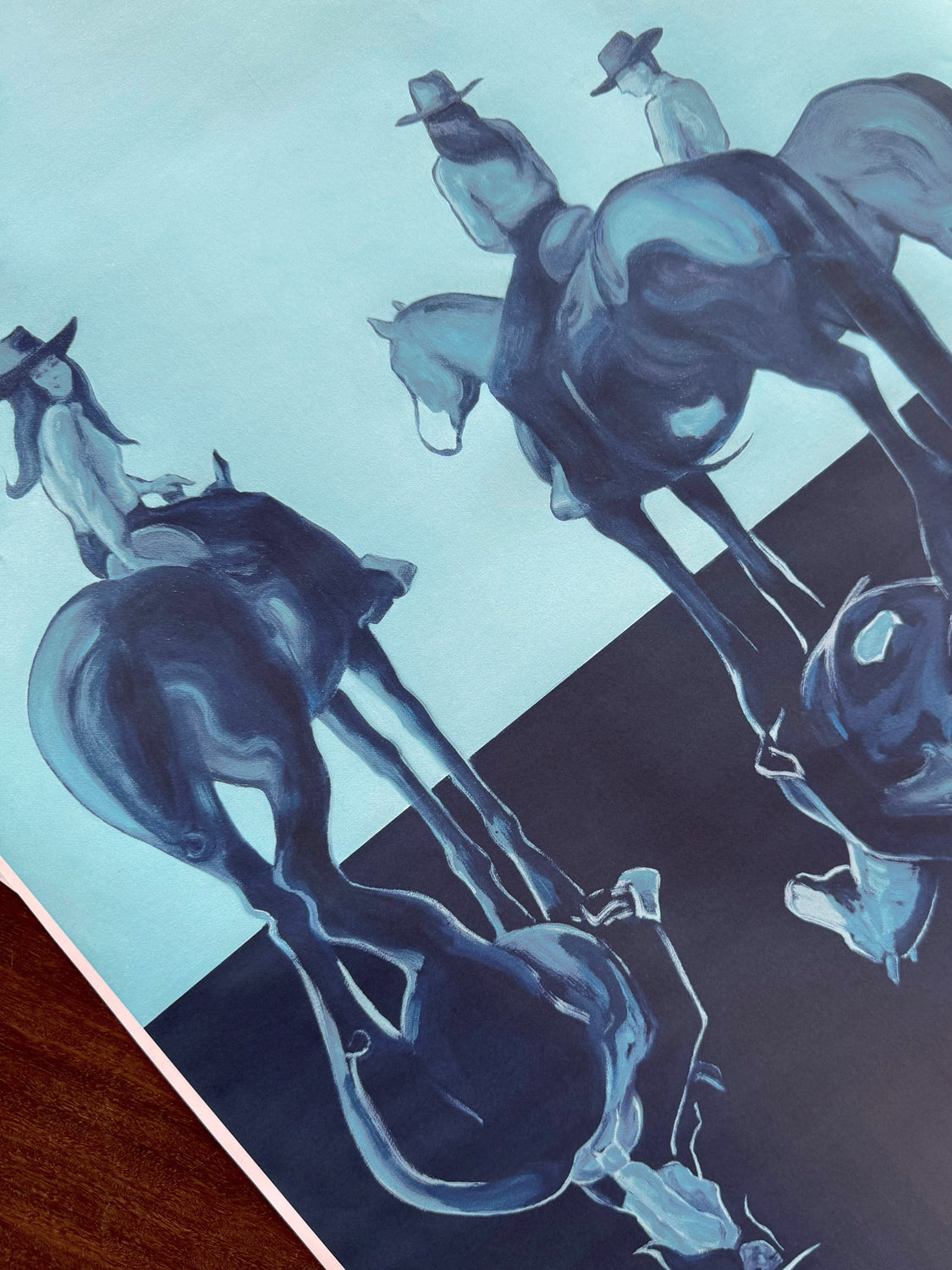 A mirrored painting of three horses and riders, Mirage by Gina Teichert is now available as a poster-print. Place your pre-orders now and receive your prints in mid February.