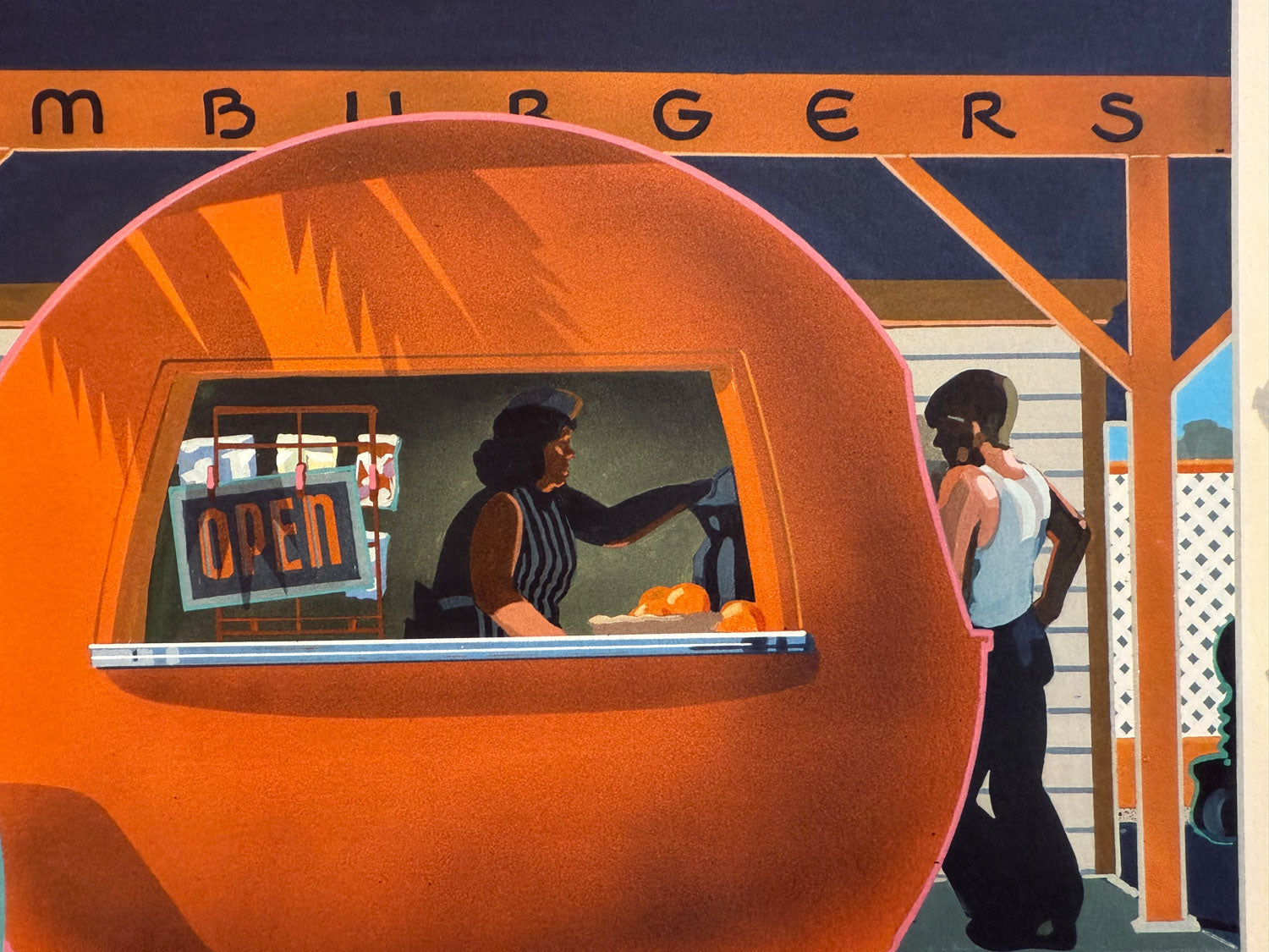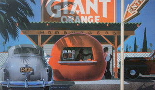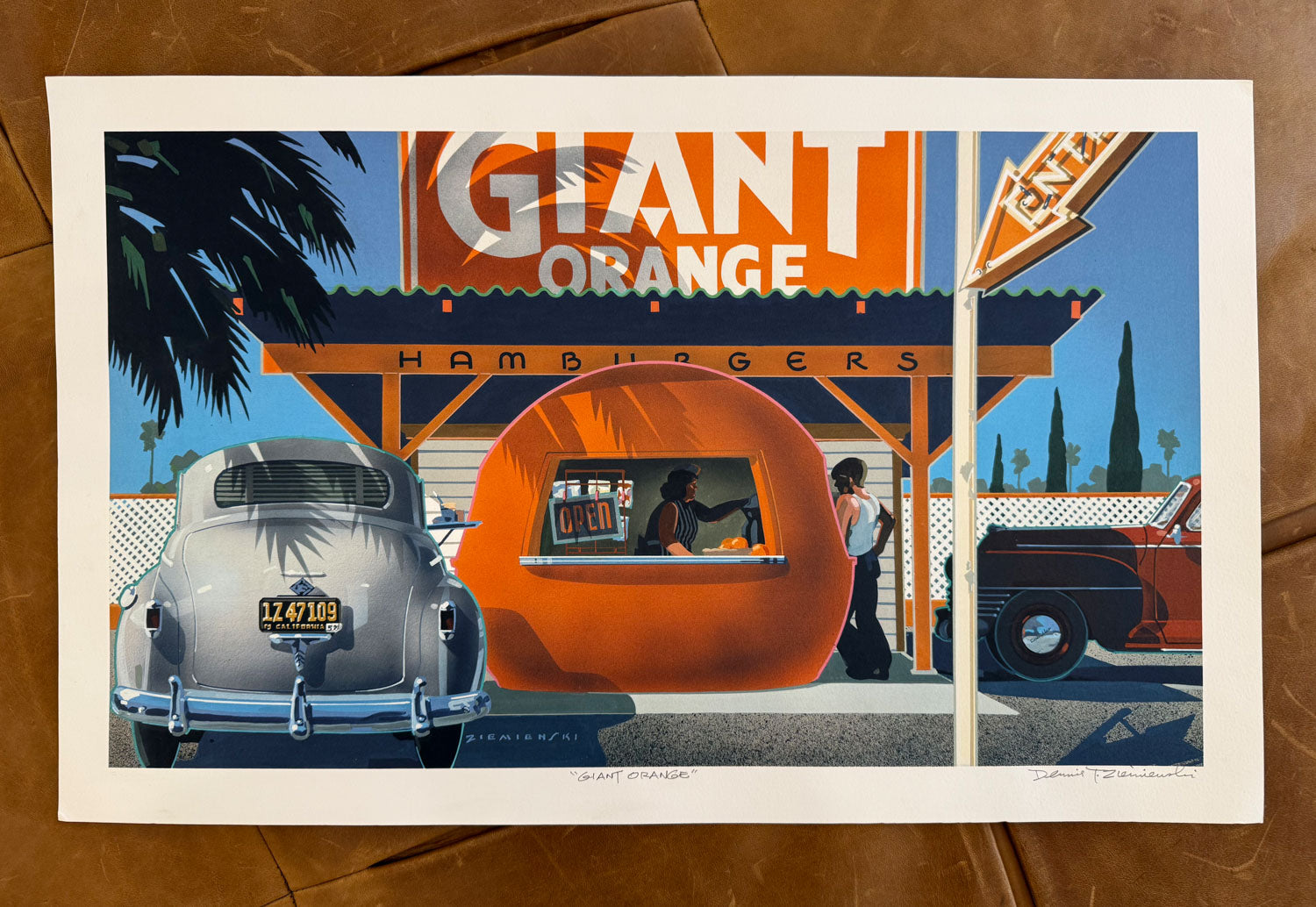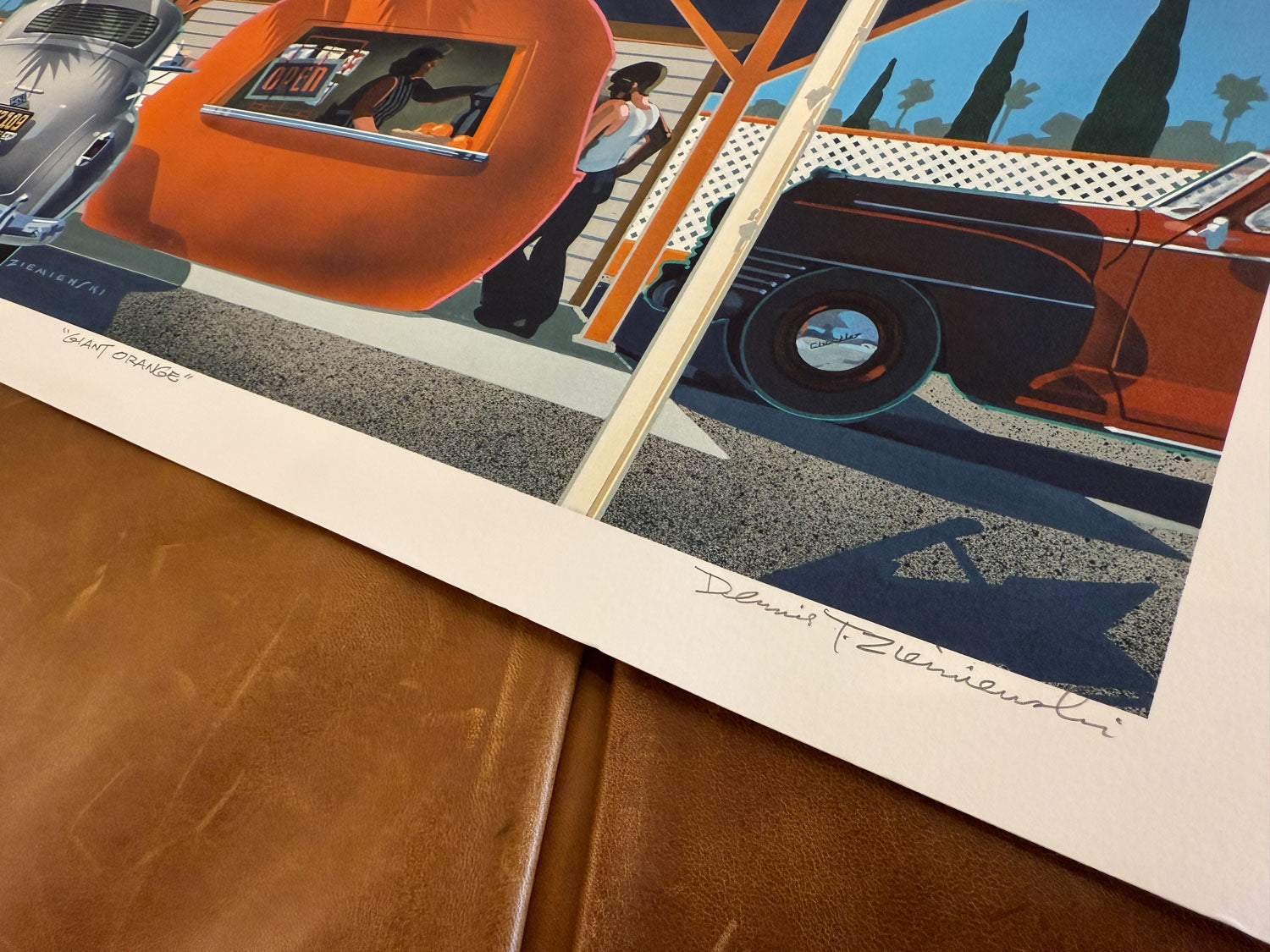 Giant Orange by Dennis Ziemienski is mid century nostalgia at its best. Complete with classic cars and a neon sign, this retro drive in brings a smile. Grab one of his last ever giclée prints of this crisp and juicy work to add some California cool to your home.